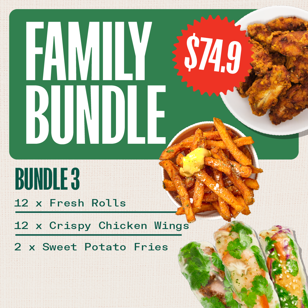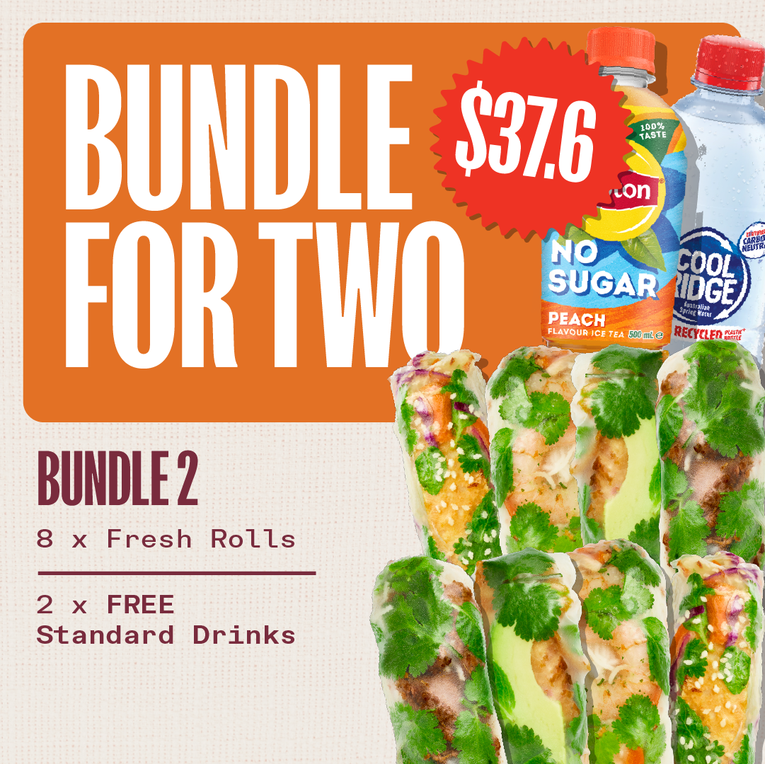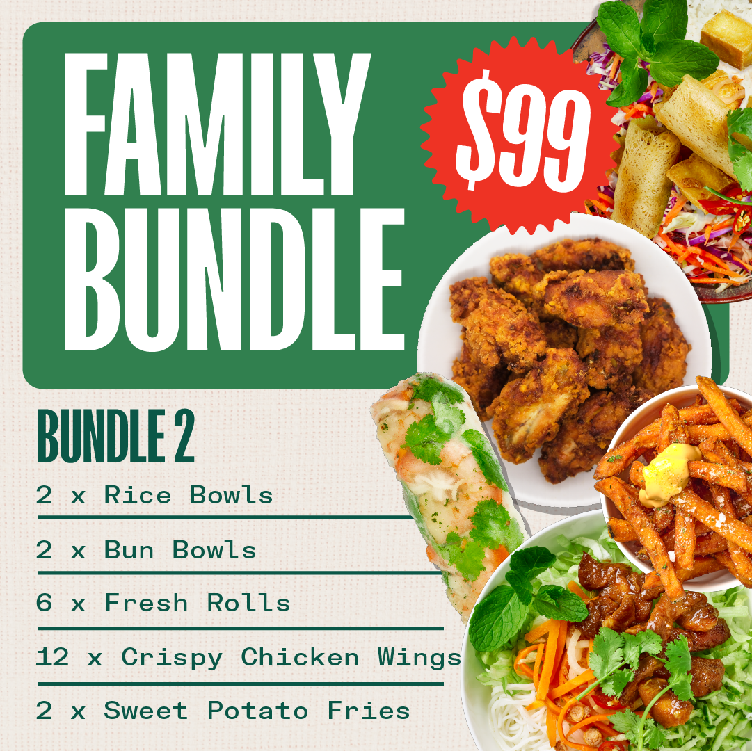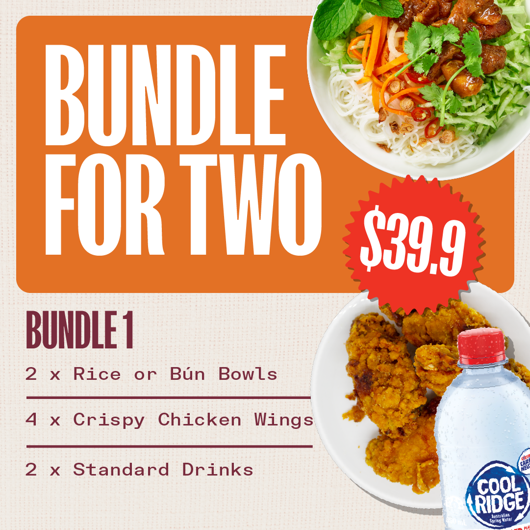 Pick your favourite 2 x Rice OR Bun Bowls and 4 x Fresh Rolls. Enjoy 8 x Crispy Chicken Wings on the side, as well as 4 x Standard Drinks for the whole family.